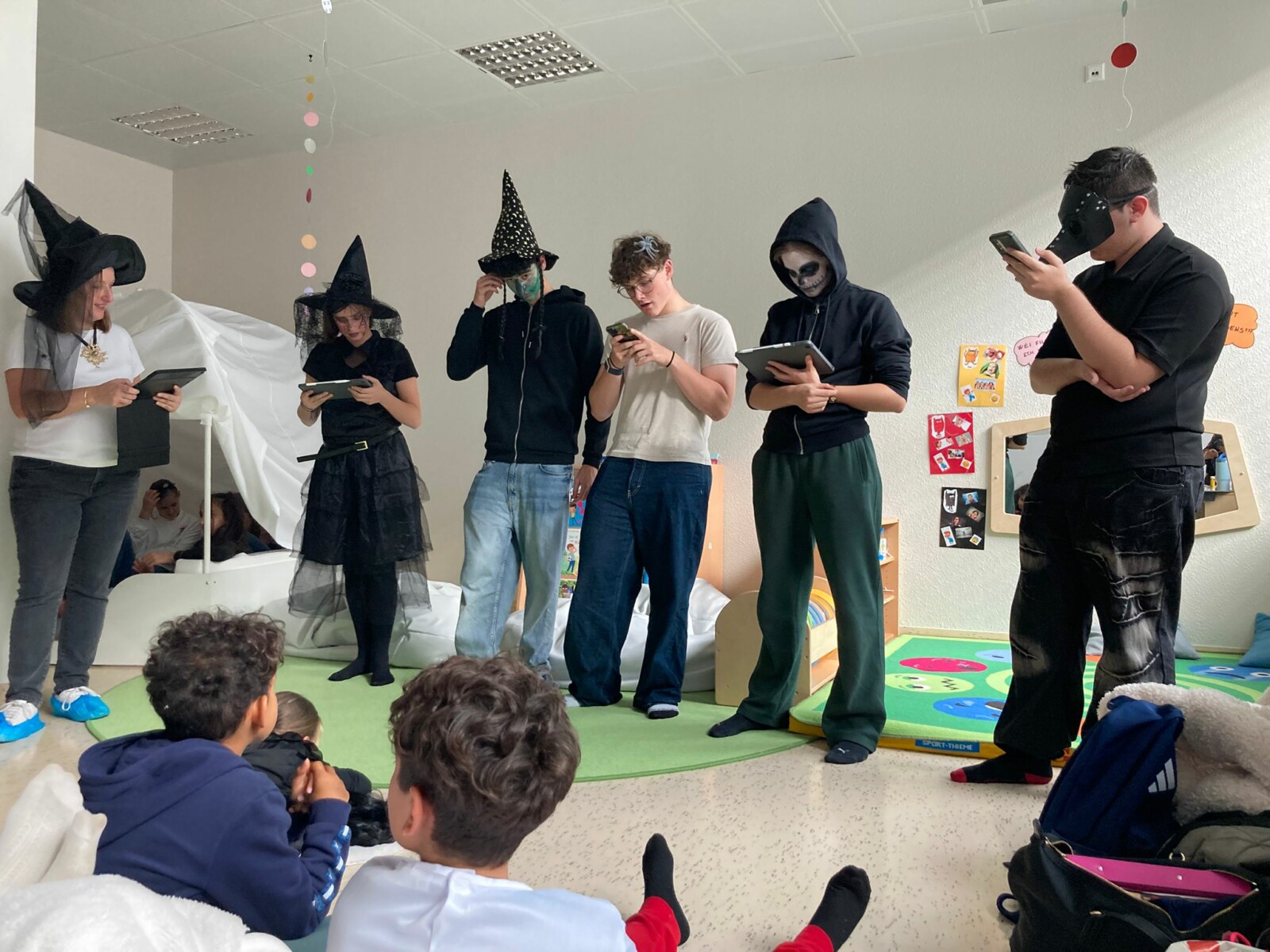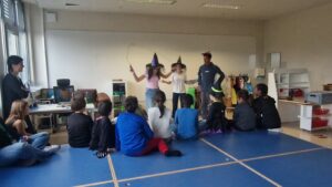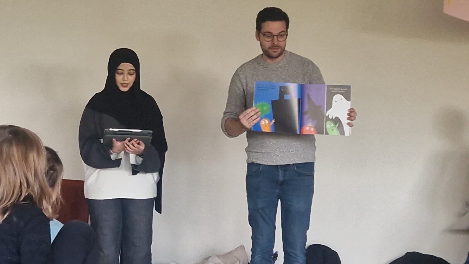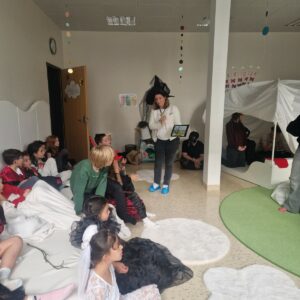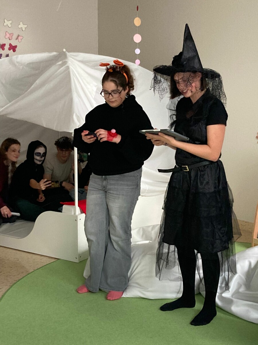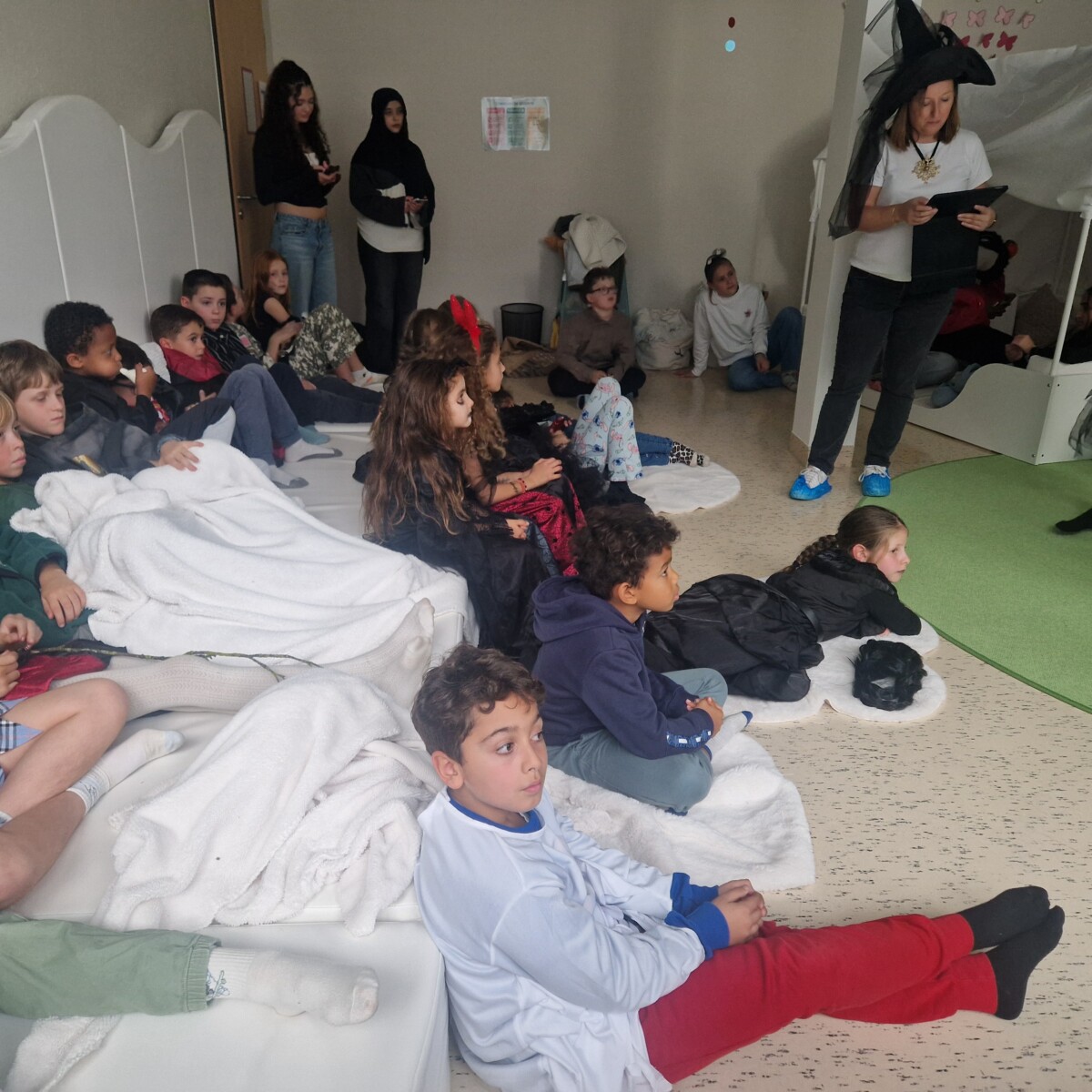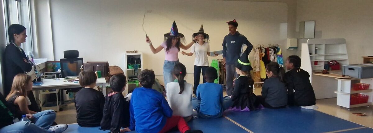 Lecture de contes effrayants – animée par les élèves du lycée EIMAB, cette activité a permis aux enfants de découvrir des histoires captivantes dans les quatre langues du pays.