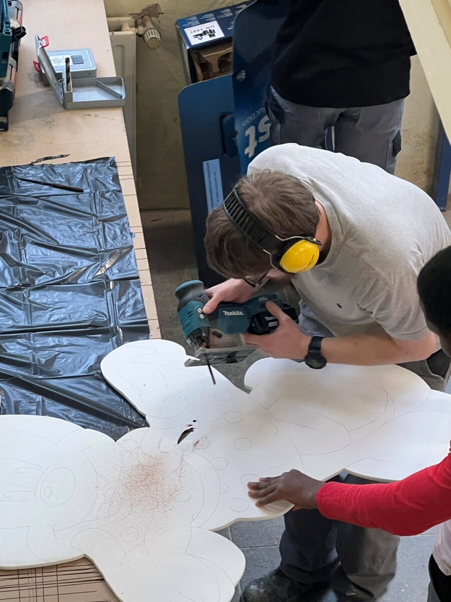 Au-delà de la dimension artistique, cette initiative se distingue par son potentiel éducatif, social et inclusif. Le projet offre un environnement où les participants peuvent retrouver des repères, réapprendre les rythmes du travail et développer des compétences concrètes. La création de figures en bois s’inscrit parfaitement dans cette démarche pédagogique, mais va également au delà de cette approche. Les objectifs éducatifs et sociaux sont de développer des compétences techniques (mesure, projection des figures sur bois, dessin, découpe, ponçage et peinture), favoriser la confiance en soi en participant à un projet valorisant et visible pour la communauté, stimuler le travail en équipe, encourager également la créativité et responsabiliser les jeunes participants autour d’un projet à destination d’un public vulnérable.