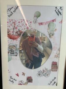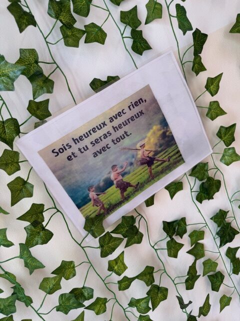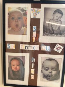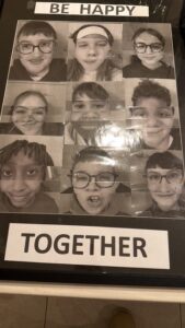 Nous avons pris des photos des visages des enfants, découpé les différentes parties (yeux, nez, bouche, cheveux) puis mélangé le tout façon puzzle. Les combinaisons ont provoqué beaucoup de rires ! Ce cadre porte le message « Be Happy Together » soulignant l’importance du vivre-ensemble et du partage.