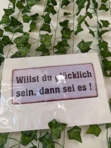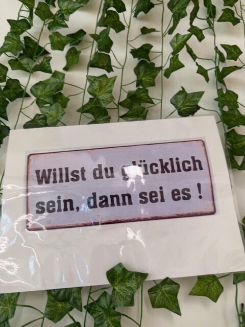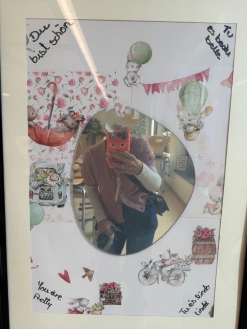 Un miroir placé au centre du cadre, entouré de messages positifs en plusieurs langues :