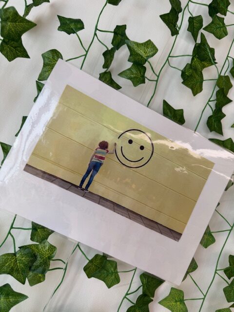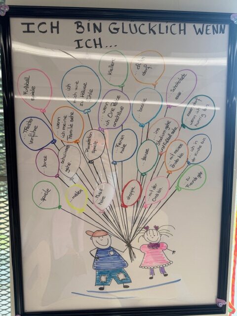 Un grand dessin d’un petit garçon et d’une petite fille tenant des ballons a été décoré avec des mots choisis par les enfants : jouer, foot, shopping, famille… Chaque mot reflète ce qui leur apporte de la joie au quotidien.