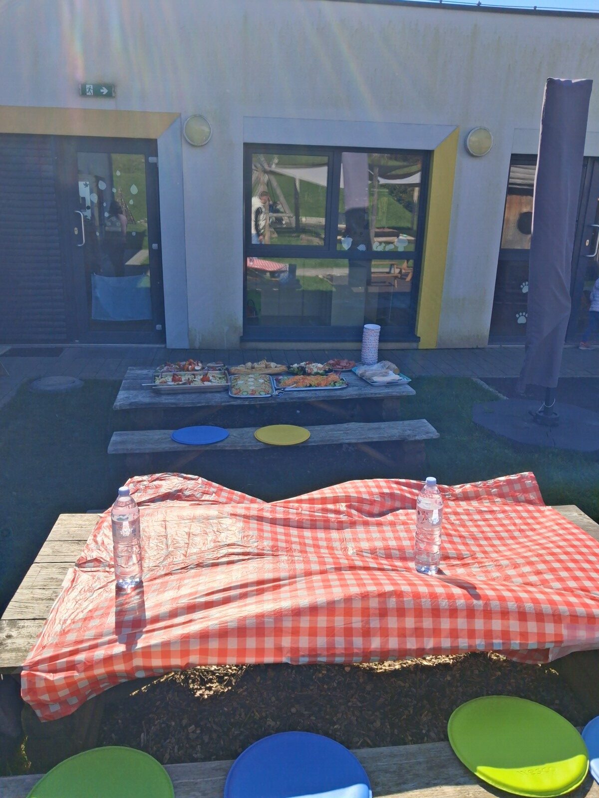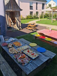 Ronderëm e leckere Picknick, preparéiert vum Restaurant vun der Gemeng , hunn Elteren an d’Equipe sech an enger frouer a gemittlecher Atmosphär getraff. Et war e schéine Moment an e flotter Austausch. D’Elteren hunn hir Gefiller iwwert d’Crèche, hir Erfahrung an d’Emotiounen an dëser wichteger Zäit deele kënnen.