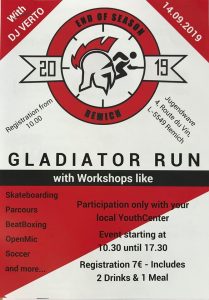 Dëst Joer huet Jugendhaus Sandweiler déi éischte Kéier um End of season Event deel geholl. Dësen gouf vun den Jugendhaiser Mutfert, Réimech, Schëtter, Duelem, Cirje an Criaj organiséiert. Am Mëttelpunkt stoung den Gladiator Run, wou 3 vun eisen Jonken drun deel geholl hunn an och un hier kierperlech grenzen komm sinn. Nieft dem groussen sportlechen Event, konnten déi Jonk sech nach un aneren Atelieren probéieren, wéi Skateborading, Beatboxing, Openmic, an villes méi. D’Wieder huet och matgespillt, sou datt dësen Dag een gelongent sportlech Event war mat vill Spaass an Freed.