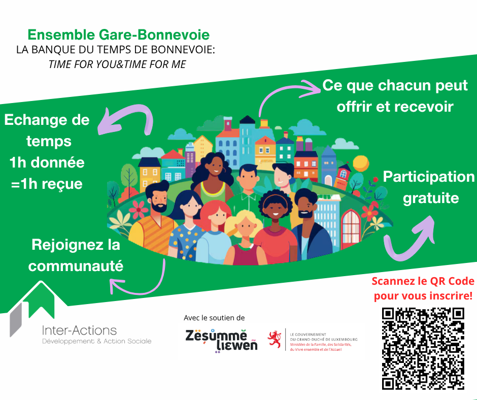 Enfin, nous avons continué la création d’un nouveau projet : la banque du temps, une initiative solidaire qui permettra aux habitants d’échanger des services et des compétences, 1 heure donnée = 1 heure reçue.