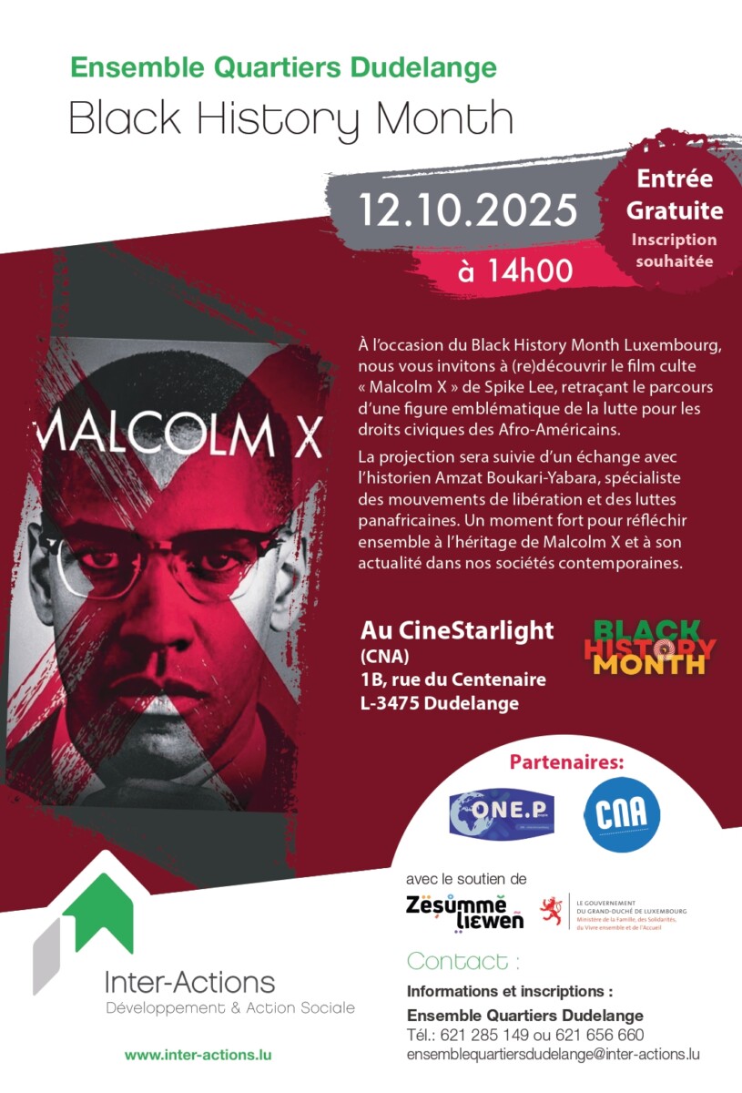 Am kader vum Black History Month invitéiren de Service Ensemble Quartiers Diddeleng, One People – ASBL an de Centre national de l’audiovisuel (CNA) Iech fir de Kultfilm „Malcolm X“ vum Spike Lee z’entdecken, deen de Parcours vun enger emblematescher Figur am Kampf fir Biergerrechter vun den Afro-Amerikaner erzielt.