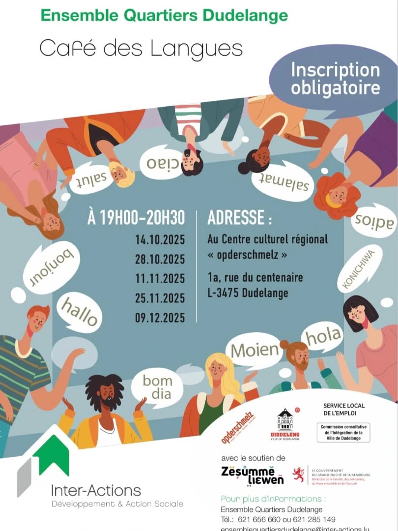 LU – Hei kennt dir an enger flotter, konvivialer Atmosphär déi Sprooch an d’Praxis brengen, déi am gangen sidd ze léieren. D’Zil vum Café des Langues ass net nëmmen d’Sprooch ze üben, mä och de Mënschen d’Méiglechkeet ze ginn, sech géigesäiteg besser ze verstoen an duerch d’Sprooch en Deel vun der Gesellschaft ze ginn.