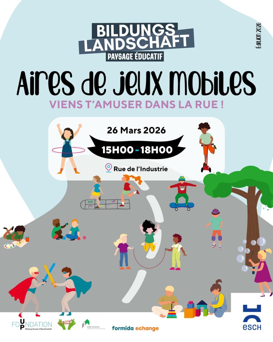 Le jeudi 26 mars, la rue de l’Industrie a accueilli une nouvelle édition des aires de jeux mobiles « Spillstroossen », transformant, le temps d’un après-midi, l’espace public en un véritable lieu de vie et de partage. Entre soleil, pluie et neige, petits et grands se sont retrouvés autour de jeux en plein air.