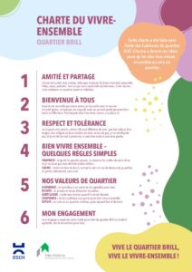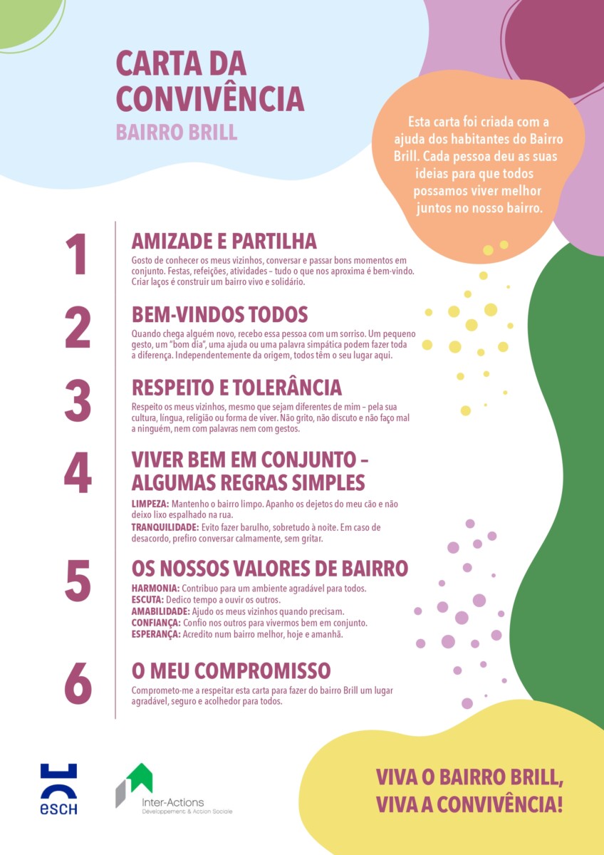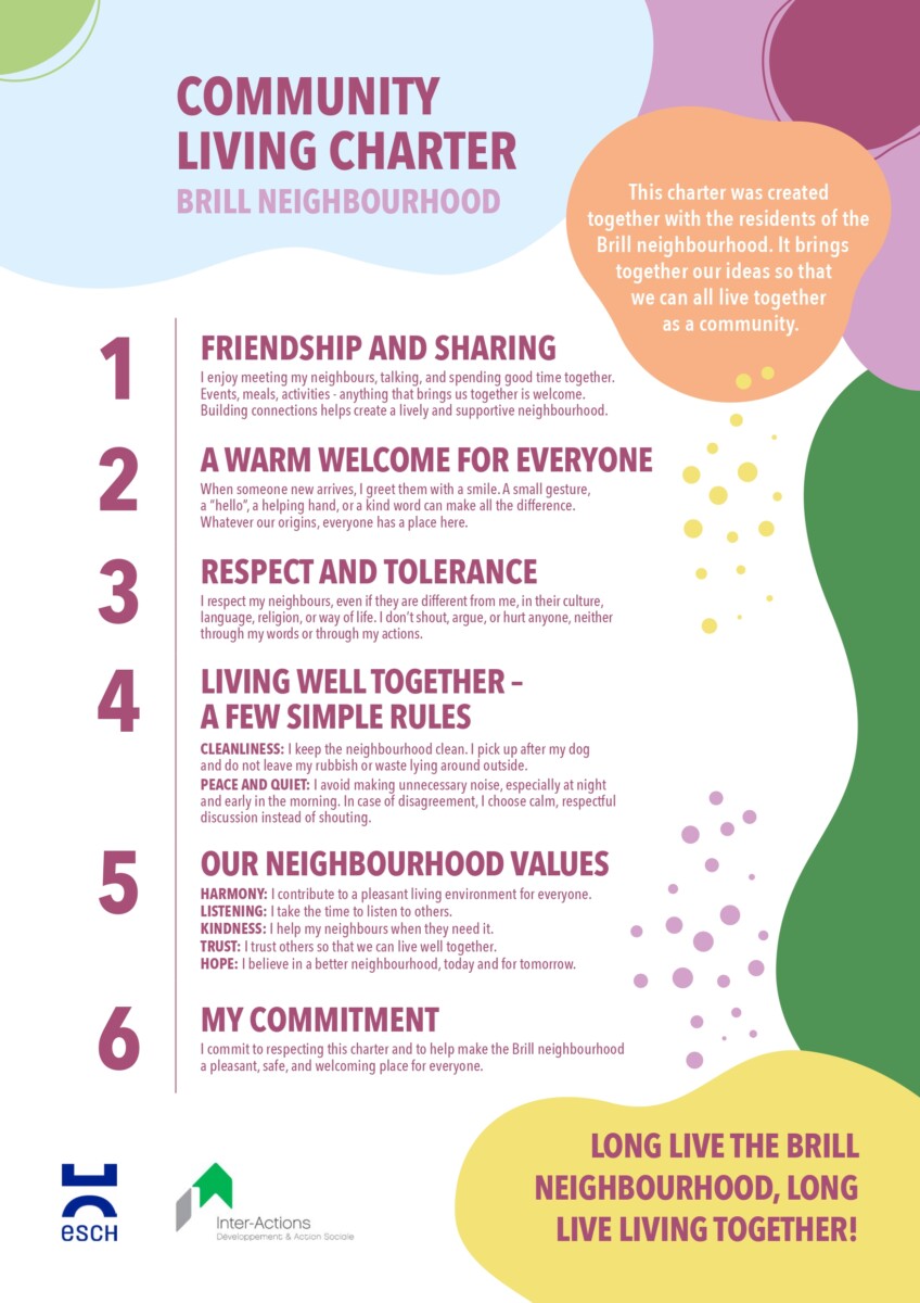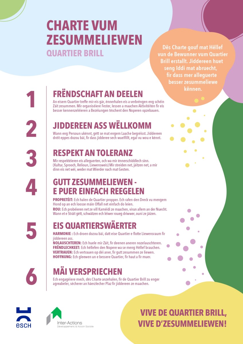 À partir de ces contributions, une Charte du vivre-ensemble quartier Brill a été co-construite. Afin de la rendre accessible au plus grand nombre, la charte a été traduite en quatre langues : français, luxembourgeois, anglais et portugais.