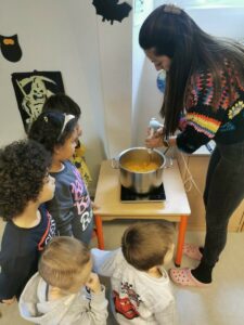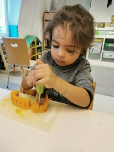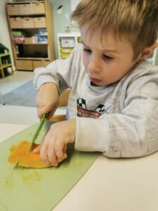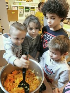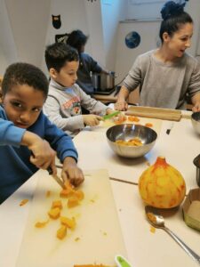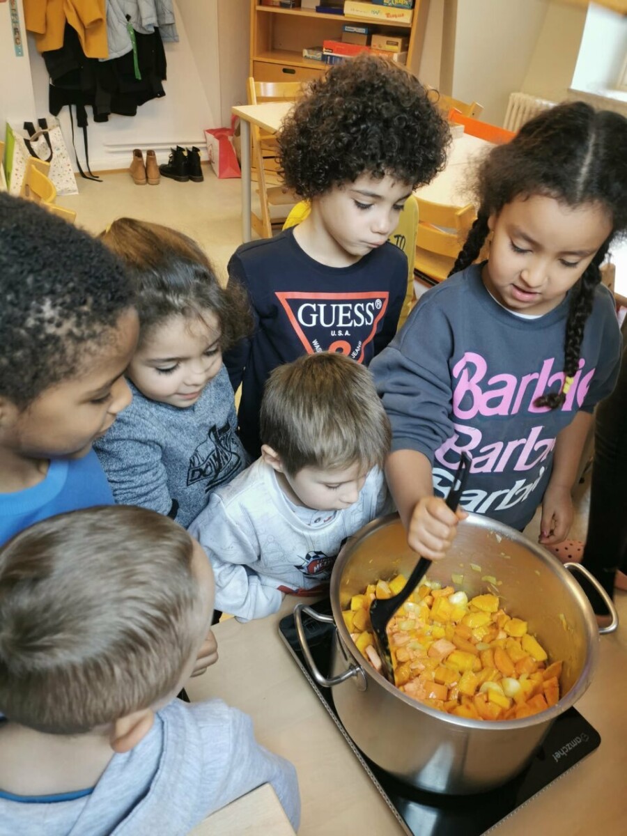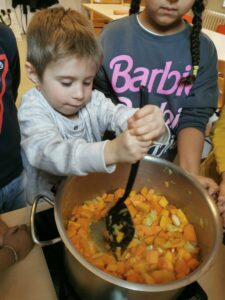 Nous avons décidé de préparer une soupe au potiron, en lien avec la saison automnale. Avec les enfants, nous avons d’abord observé les ingrédients nécessaires, puis chacun a participé à sa manière : éplucher, couper les légumes en petits morceaux et les ajouter dans la casserole. Celle-ci avait été installée sur une table basse afin que les enfants puissent suivre toutes les étapes de la préparation.
