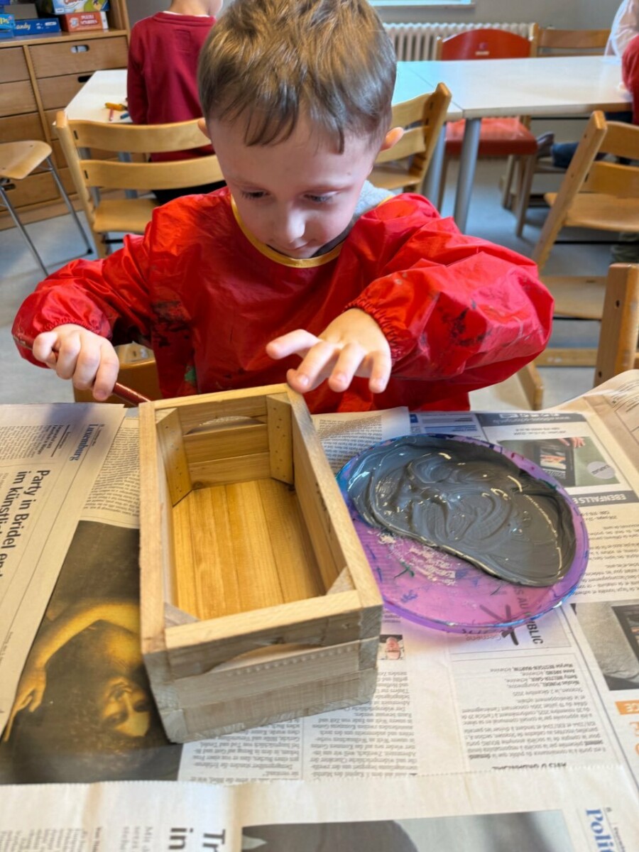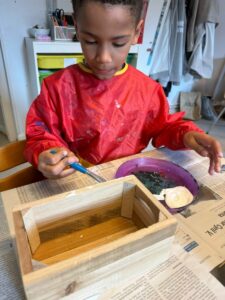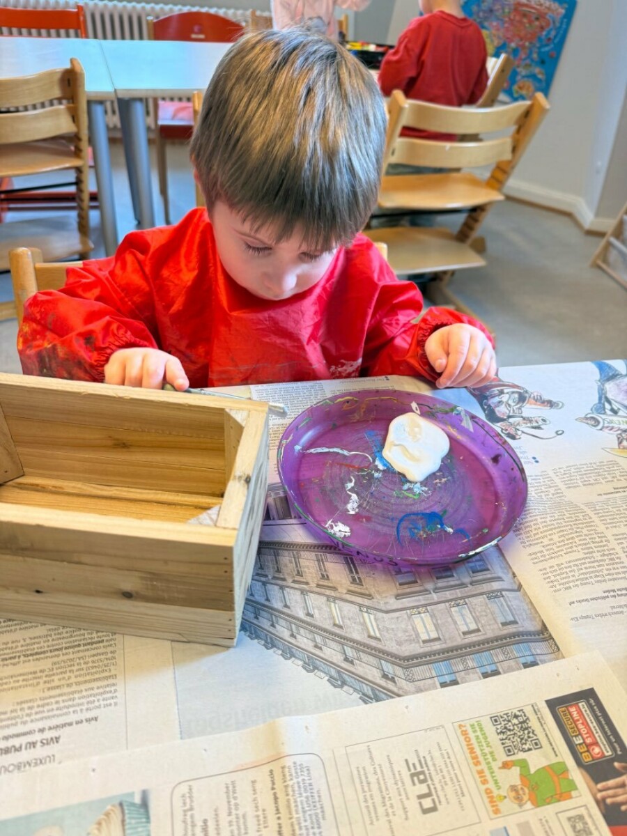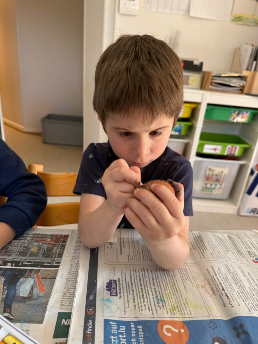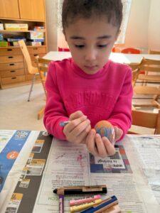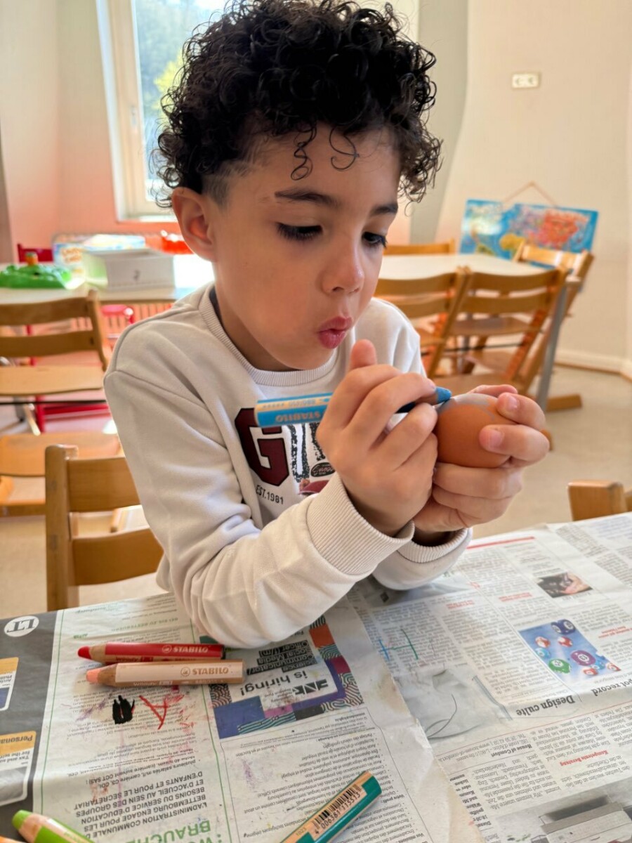 Une fois leur panier terminé, les enfants ont poursuivi l’activité en décorant des œufs. Dans un premier temps, ils ont dessiné différents motifs à l’aide de crayons. Ensuite, les œufs ont été plongés dans la peinture afin de faire apparaître les dessins et les couleurs choisies.