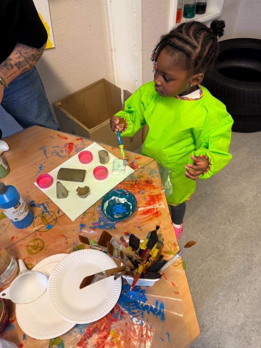 Ce projet a permis aux enfants de créer ensemble, de valoriser le recyclage et d’explorer la couleur et la matière de manière ludique et pédagogique.