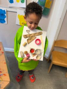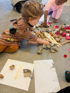 Chaque enfant a reçu une toile individuelle et a pu utiliser librement tous les matériaux disponibles. Ils ont organisé et fixé les éléments selon leurs propres idées, développant ainsi leur créativité et autonomie.