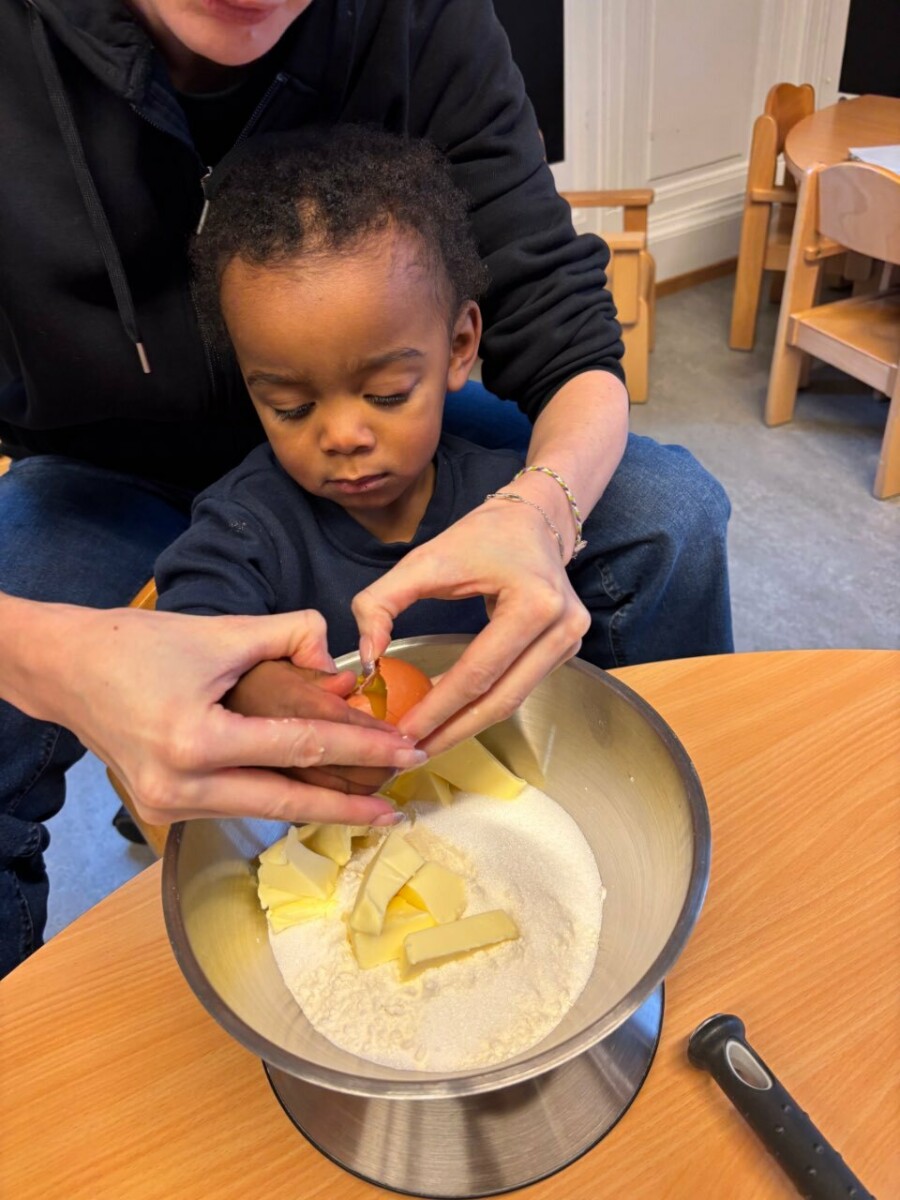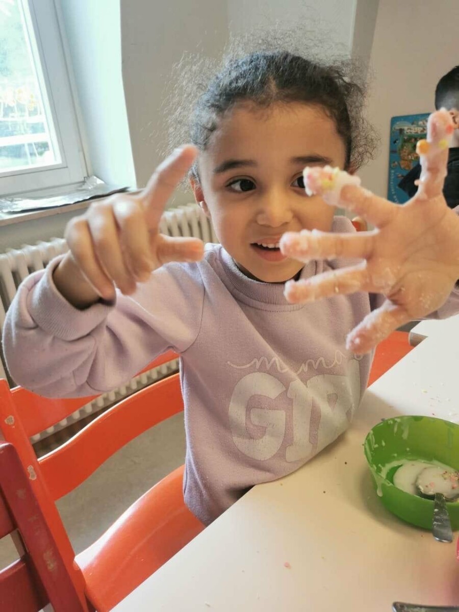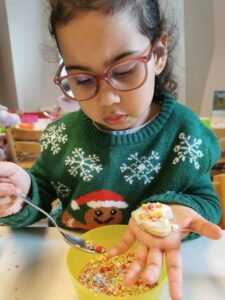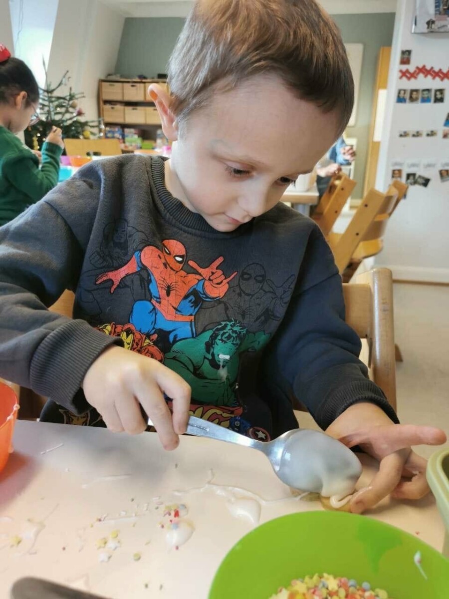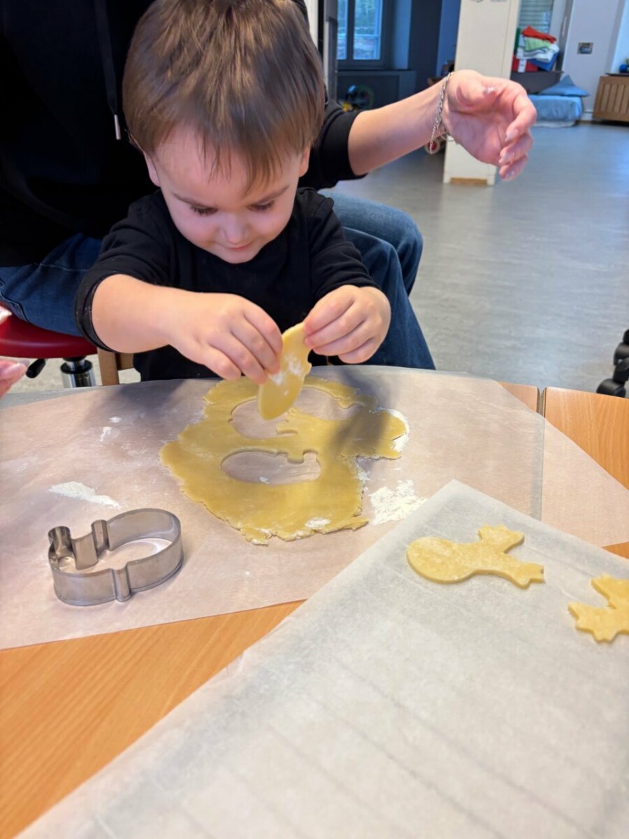 Après la cuisson, assurée par l’équipe éducative, les biscuits ont été laissés à refroidir. Quelques jours plus tard, les enfants du groupe scolaire ont pu les décorer à l’aide d’une pâte à sucre (sucre et eau) ainsi que de différents éléments décoratifs. Chaque enfant a ensuite pu emporter ses biscuits à la maison, soigneusement emballés dans un sachet ou une boîte apportée par les parents. Cela a également permis aux familles de découvrir concrètement ce que leurs enfants avaient réalisé à la crèche.