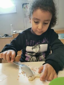Cette activité a permis de stimuler de nombreux aspects du développement de l’enfant : le langage, la motricité fine, les sens ainsi que la coopération, puisque les enfants ont travaillé ensemble pour réaliser un projet commun. Les enfants ont montré beaucoup d’enthousiasme et d’intérêt, observant chaque étape avec attention et participant activement. Manipuler le rouleau et les emporte-pièces s’est révélé être une activité motrice accessible et très motivante pour eux.
