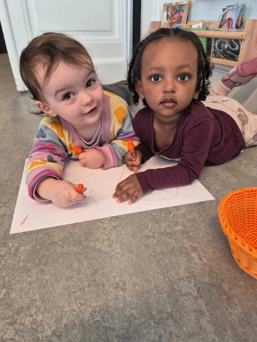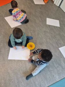 Nous accompagnons les enfants tout au long de cette activité en nommant les couleurs avec eux, tout en leur laissant une grande liberté d’exploration et de création. L’accent est mis sur l’autonomie, la découverte et le plaisir d’expérimenter.