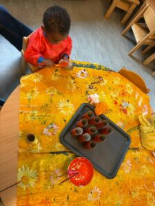 Nous avons choisi de réaliser cette activité individuellement avec chaque enfant. Cela nous permet de mieux les accompagner et de leur offrir de l’aide lorsqu’ils en ont besoin. Avec ce groupe, cette méthode fonctionne particulièrement bien : pendant qu’un enfant crée sa citrouille, les autres peuvent observer tranquillement ou jouer librement. Ceux qui souhaitent participer viennent ensuite chacun leur tour, et cela se fait toujours dans le calme et la bonne humeur.