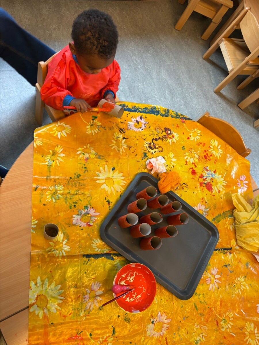 Les enfants sont désormais habitués à ce fonctionnement : il n’y a jamais de dispute pour savoir qui passe en premier. Chacun choisit s’il préfère peindre ou jouer, et tous respectent le rythme des autres. Souvent, ils aiment regarder leurs camarades peindre et discuter avec nous de ce qu’ils observent — un beau moment d’échange qui stimule aussi leur langage et leur curiosité.
