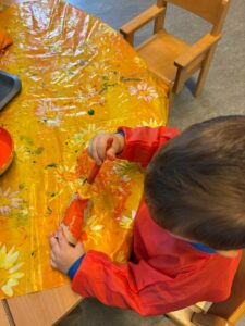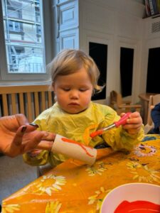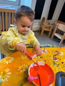 Sur le plan moteur, nous avons remarqué que certains enfants sont déjà capables de tenir l’objet et peindre seuls, tandis que d’autres ont encore besoin d’un petit soutien pour maintenir le rouleau pendant qu’ils peignent.