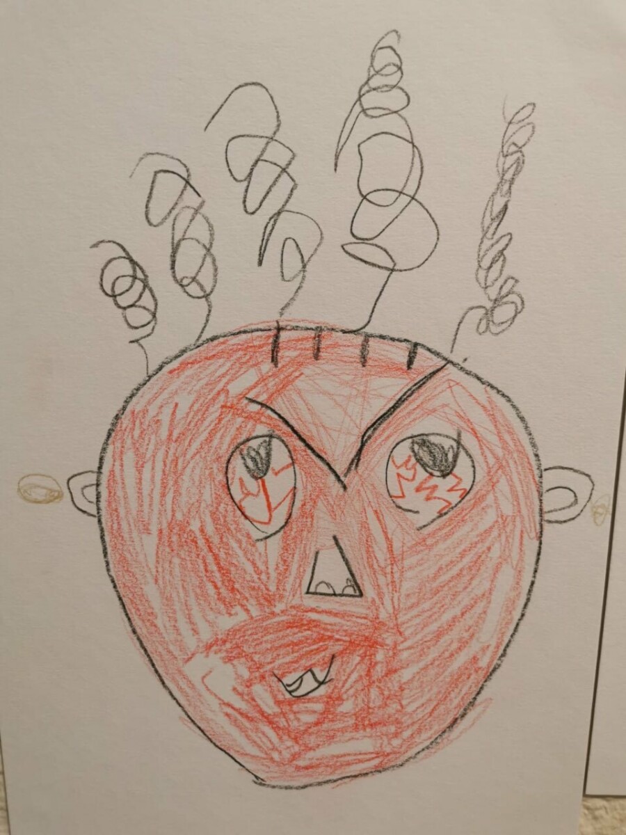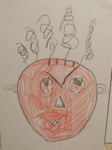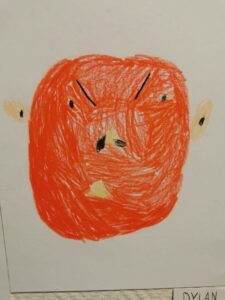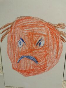 Pour terminer, les enfants ont réalisé un autoportrait de leur visage en colère. Un miroir était proposé pour les aider à observer leurs expressions. Certains l’ont utilisé, d’autres ont préféré dessiner librement.