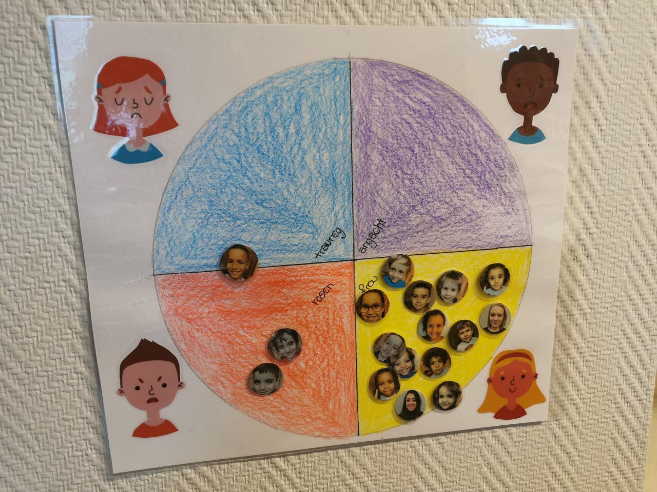 Nous avons aussi créé une roue des émotions. Chaque enfant peut y placer sa photo selon ce qu’il ressent dans la journée et la changer si son émotion évolue. Cet outil aide les enfants à exprimer leurs sentiments et à mieux les reconnaître.