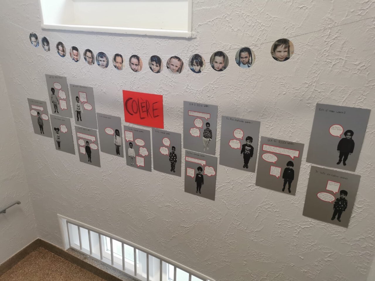 Nous avons ensuite demandé aux enfants de compléter la phrase « Je suis en colère quand… ». Une photo de chaque enfant, accompagnée de sa phrase, a été affichée dans le couloir. Nous avons pris soin de parler aux enfants dans la langue avec laquelle ils se sentent le plus à l’aise.