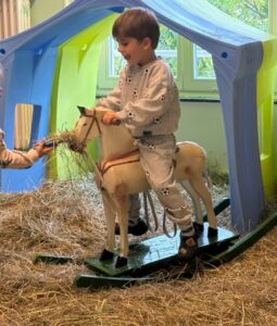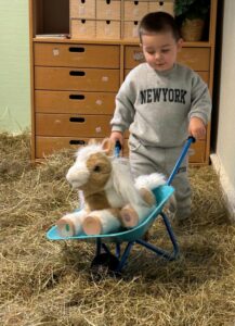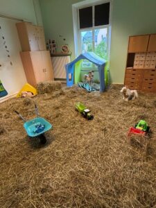 Nous avons aussi aménagé l’espace avec un cheval à bascule, un chien en peluche avec sa niche, une brouette accompagnée de gants et d’un râteau, ainsi que deux tracteurs. Cette mise en scène a créé un univers de jeu passionnant et immersif, qui a immédiatement éveillé la curiosité et l’envie de jouer des enfants.