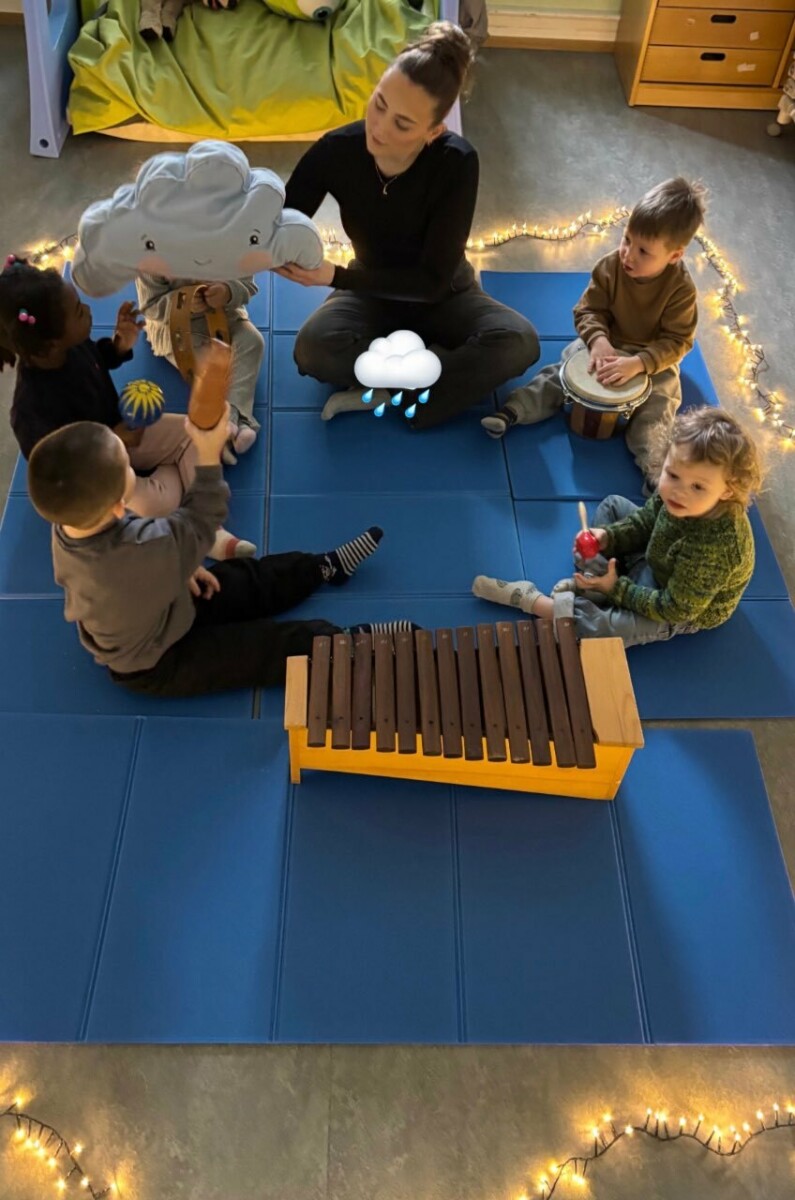Les enfants n’ont pas seulement écouté l’histoire : ils l’ont vécue à travers des sons et des bruitages. À l’aide d’instruments simples (hochets, clochettes, tambours aux sons doux) et de matériaux du quotidien, ils ont rendu les émotions du nuage audibles. Les tonalités calmes et délicates ont soutenu l’atmosphère de l’histoire et permis aux enfants de percevoir la tristesse de manière sensorielle et adaptée à leur âge.