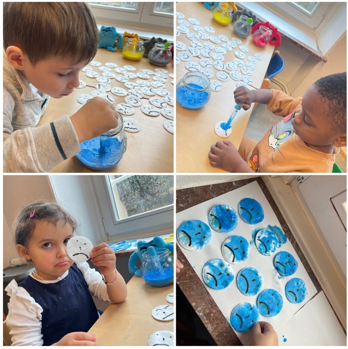 Après la lecture, les enfants ont participé à un « jeu des smileys » : parmi différentes expressions, ils devaient identifier les visages tristes. Ils ont ensuite colorié ces smileys à l’aide de pipettes et de peinture bleue. Les cotons décorés ont été assemblés pour créer une affiche exposée à la vue des parents.