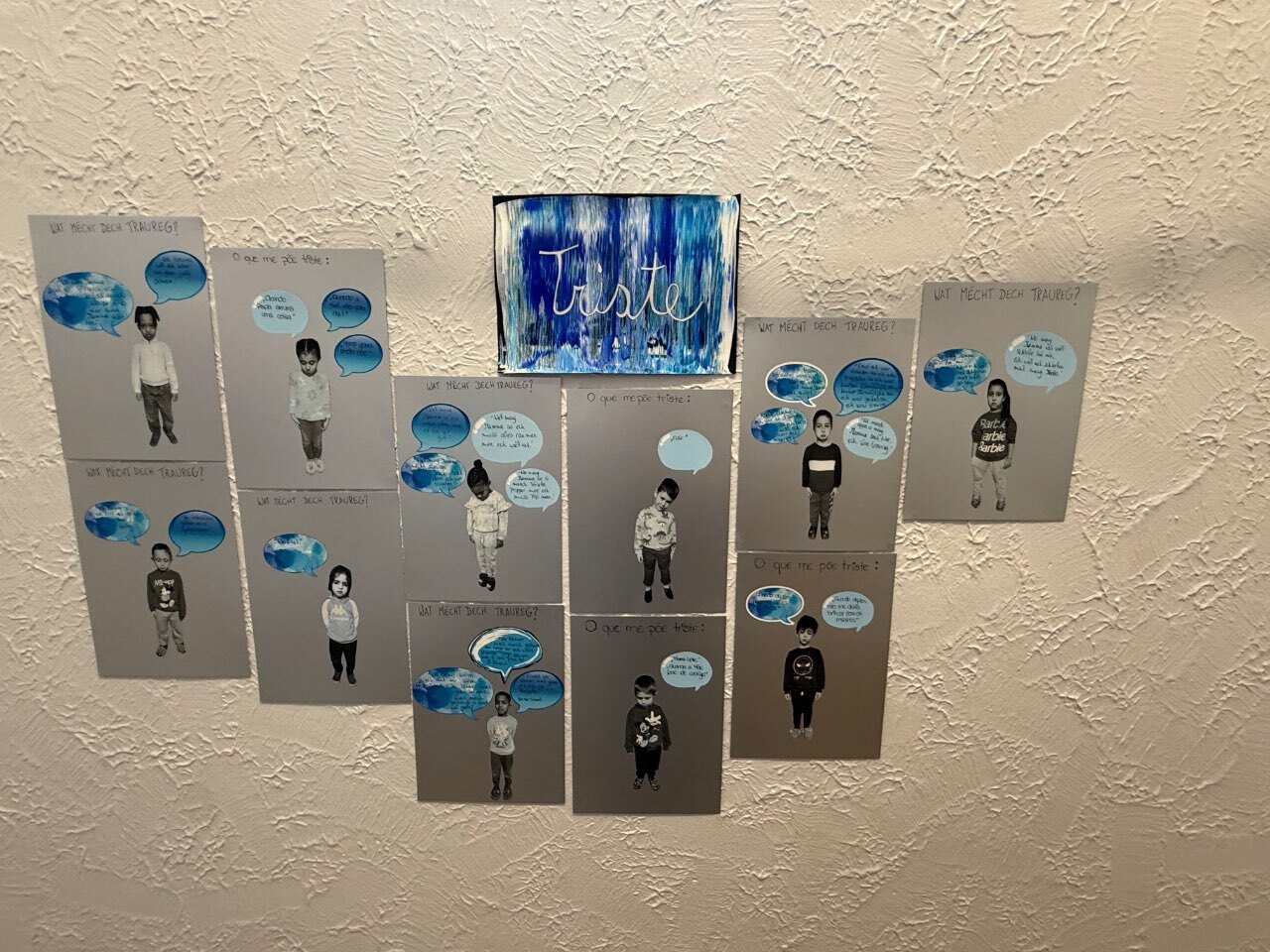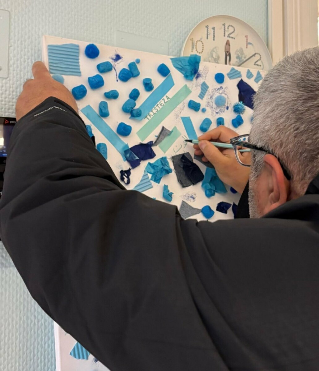 Les parents ont ensuite été invités à participer : chaque famille a écrit le mot « triste » ou « tristesse » dans sa langue d’origine sur le collage. Le résultat est une œuvre multilingue qui reflète la richesse culturelle de notre groupe et montre que, même si les mots diffèrent, les émotions sont universelles.