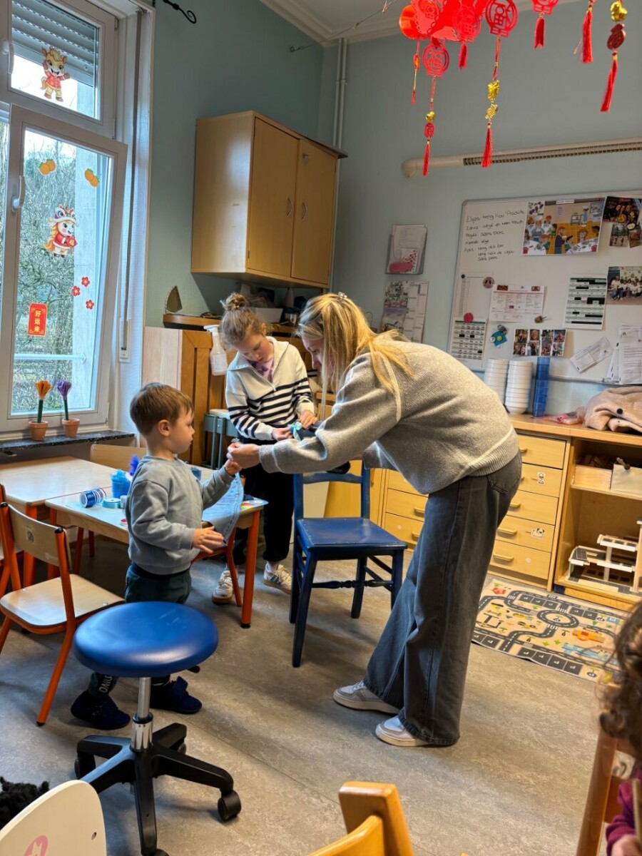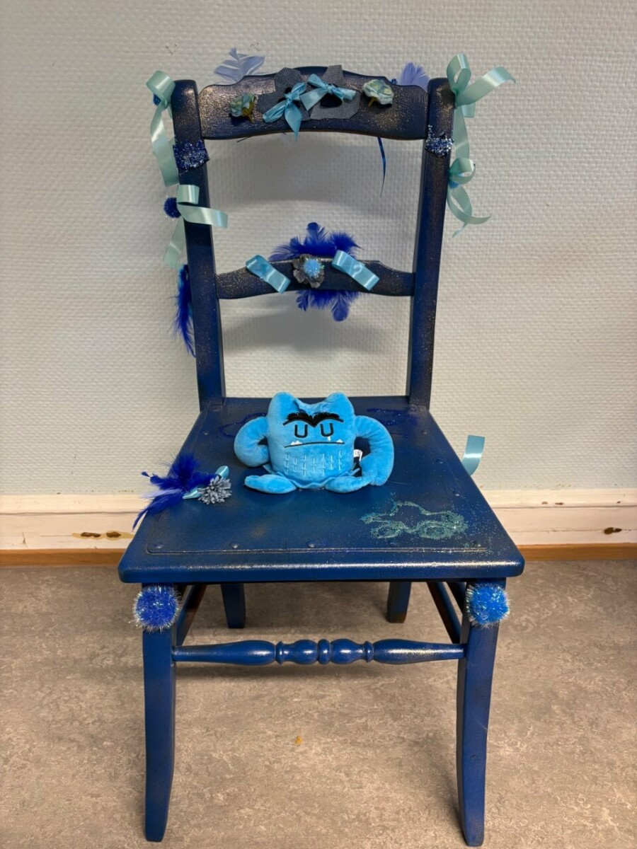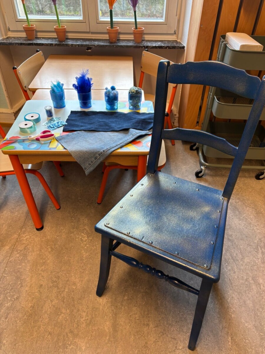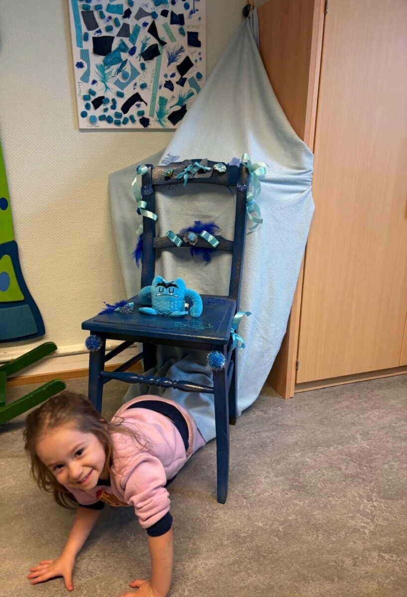 En collaboration avec les parents, nous avons également créé un fauteuil des émotions, entièrement décoré en bleu. Parents, frères et sœurs ont participé activement : découpage, collage, paillettes et divers matériaux ont permis de transformer ce meuble en une pièce unique et symbolique.