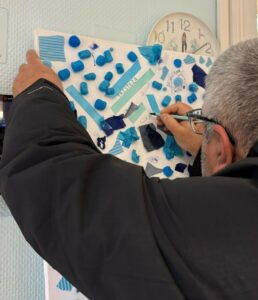 Lors d’une activité de construction, nous avons utilisé uniquement des blocs bleus, afin de rester dans la couleur associée à la tristesse.