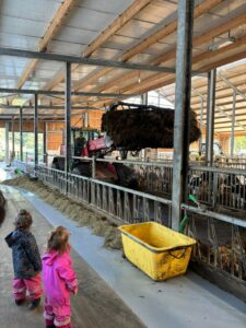 Dès leur arrivée à la ferme, les enfants ont ressenti curiosité et impatience. L’odeur de l’étable, les bruits des vaches et la vue des grandes machines leur ont ouvert un univers d’expériences totalement nouveau. En compagnie de la fermière, ils ont exploré l’étable, observé le nourrissage des vaches et découvert que le nettoyage des stalles faisait aussi partie du travail quotidien. Avec un peu de courage et sous la supervision de la fermière, les enfants ont pu caresser les vaches avec précaution et même les nourrir eux-mêmes. Ainsi, ils ont compris de manière concrète que les animaux ont besoin de soins et d’attention, et que le travail agricole, bien que physique et exigeant, est aussi très utile et gratifiant.