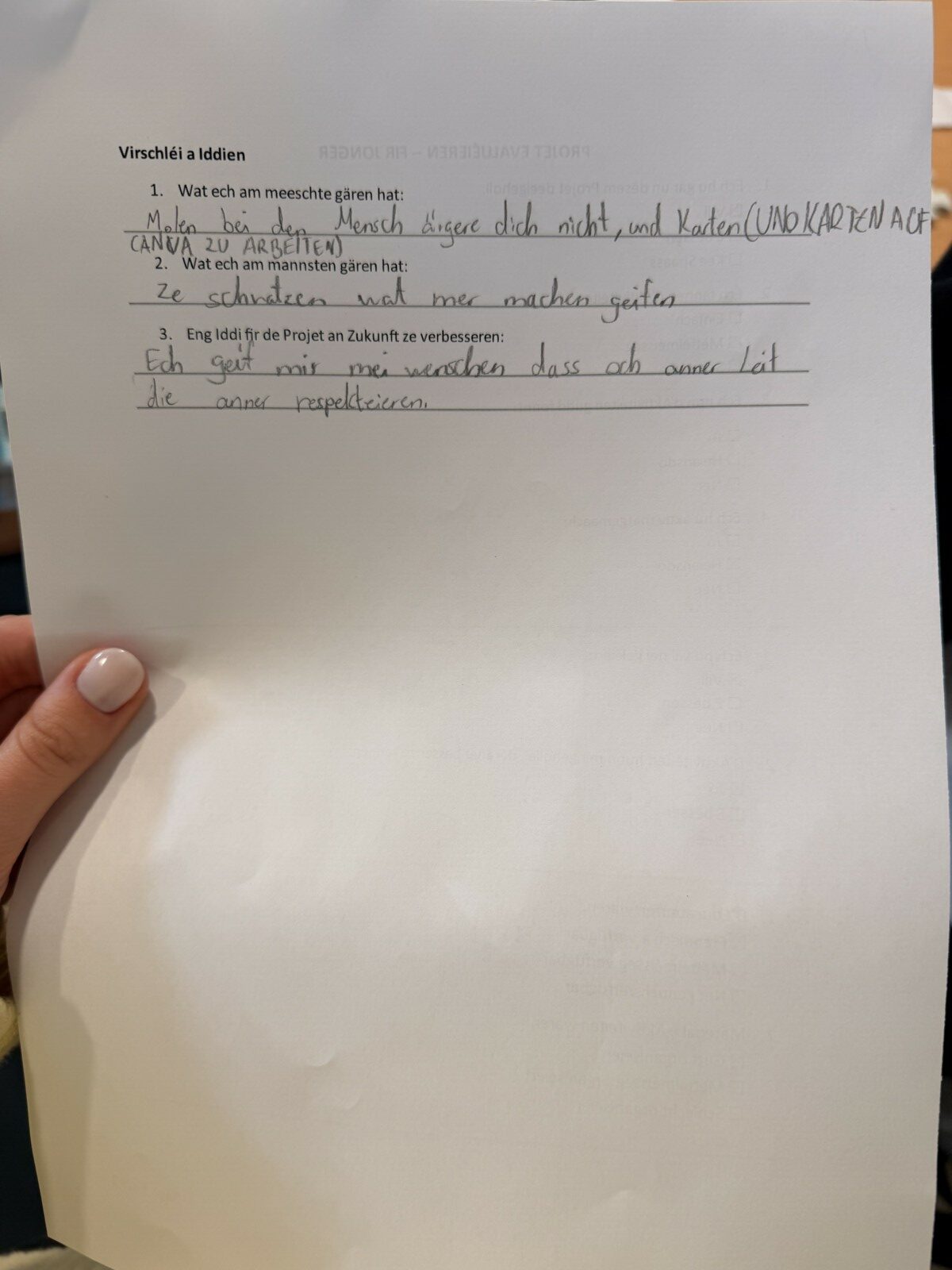 Même si, au quotidien, on essaie déjà d’échanger avec eux et d’avoir leur avis de manière informelle, on sait que ce n’est pas toujours évident pour chacun de s’exprimer. Avec ce questionnaire, ils avaient la possibilité de donner leur retour de manière anonyme.L’idée était de leur offrir un espace où ils peuvent dire ce qu’ils pensent librement c.à.d. ce qu’ils aiment, ce qu’ils aimeraient voir changer, ou encore proposer de nouvelles idées.