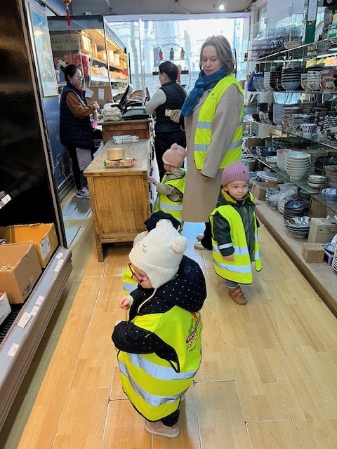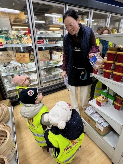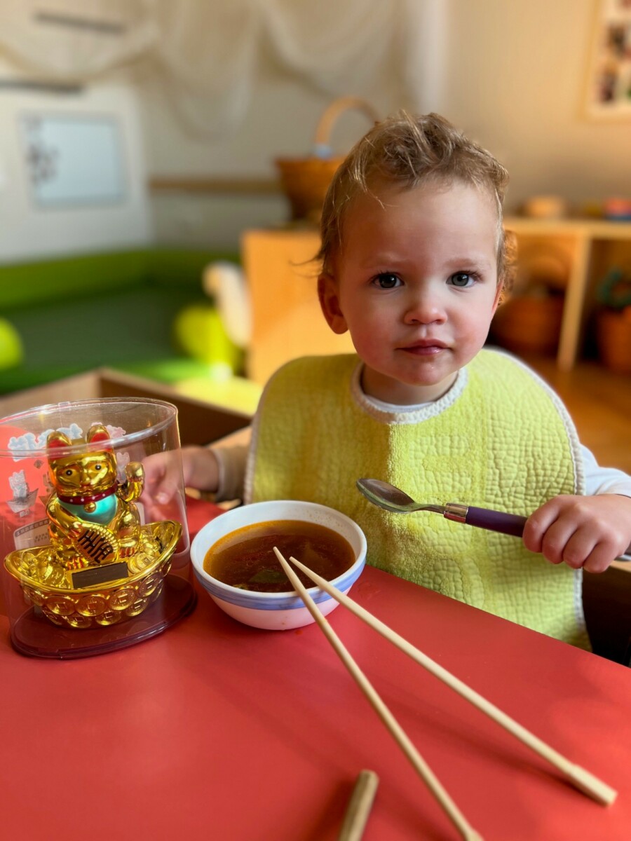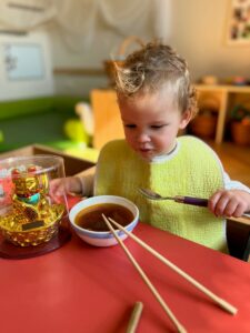 Nous avons réalisé des sorties dans des épiceries chinoises afin d’y visualiser les outils pour manger (bol et baguettes) ainsi que pour acheter l’une ou l’autre spécialité traditionnelle pour y faire la dégustation en crèche !