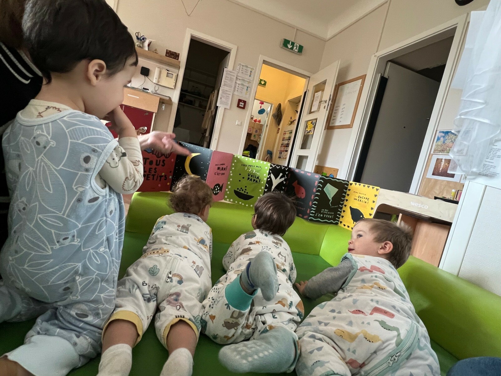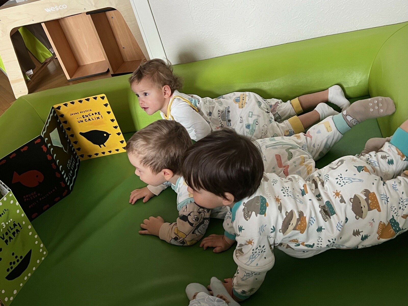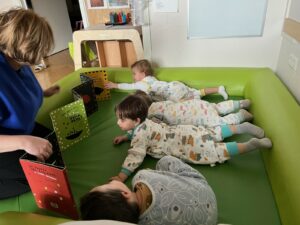 Innerhalb der Krabbelgruppe nutzen wir täglich Geschichten wie z.B. „Pas de Loup“ oder „Tous les Petits“ von der Autorin „Jeanne Ashbé“, da diese Bücher zum Schluss den Schlaf thematisieren!
