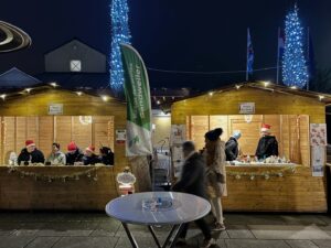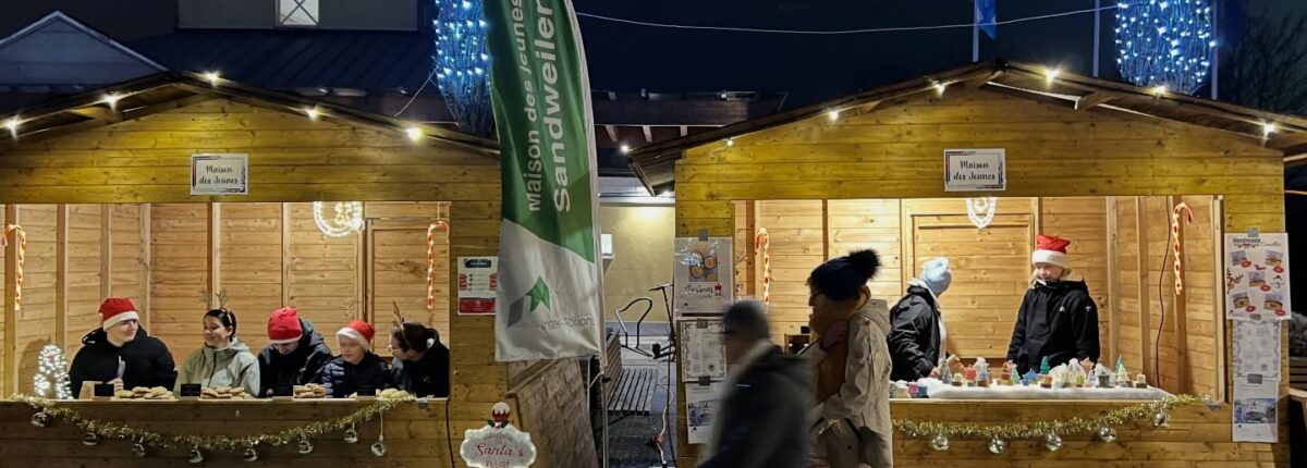 marché de Noël de Sandweiler, avec cette année, pour la première fois, deux chalets : un pour les cookies et un pour les bougies.
