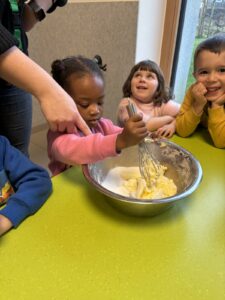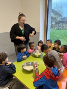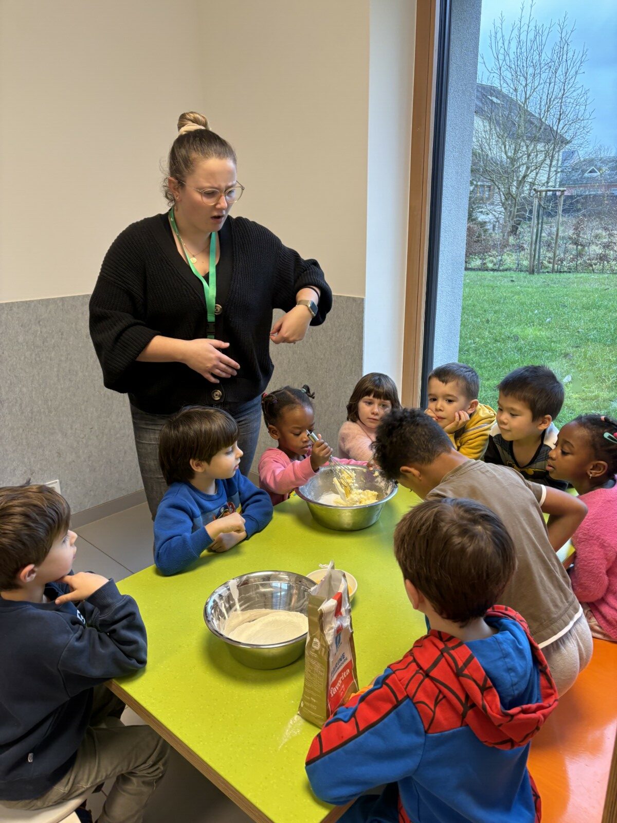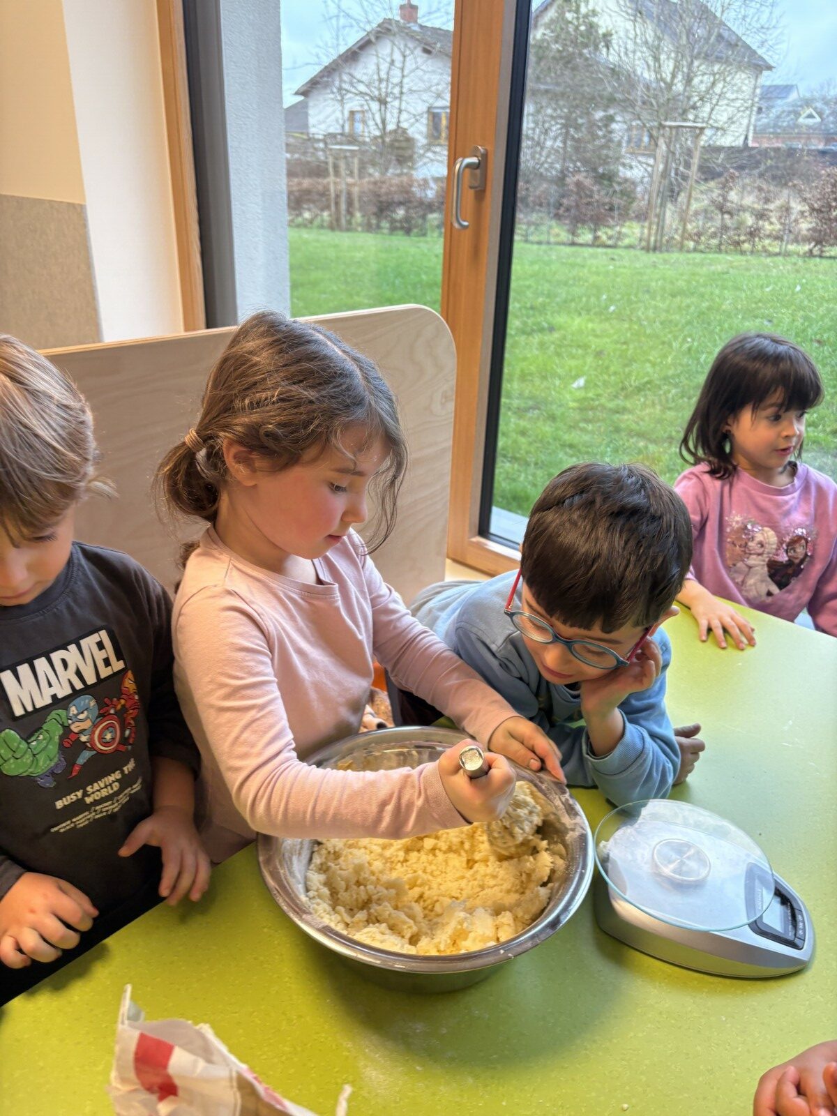 Beim Baken hunn d’Kanner déi verschidde Liewensmëttel kennegeléiert an se ofgewiicht. Duerno konnten si den Deeg knieden an d’Kichelcher mat verschiddene Formen ausstiechen, wat hinnen vill Freed gemaach huet. Dës Aktivitéit huet d’Feinmotorik, d’Koordinatioun an d’sensoresch Wahrnehmung gestäerkt. Gläichzäiteg hu si geléiert, zesummen an der Grupp ze schaffen.