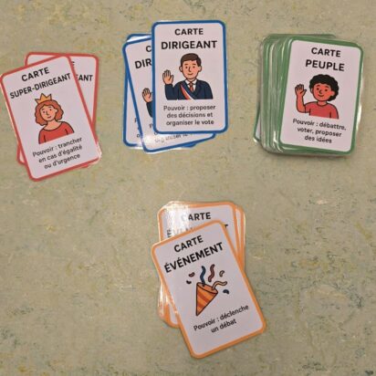 Guidés par différentes cartes et leurs éducateurs, les enfants ont participé activement aux débats en se positionnant soit en tant que « voix du peuple », « dirigeant » ou « super dirigeant ». L’objectif de cette mise en scène était de découvrir explicitement l’importance de la démocratie, parallèlement à une dictature.