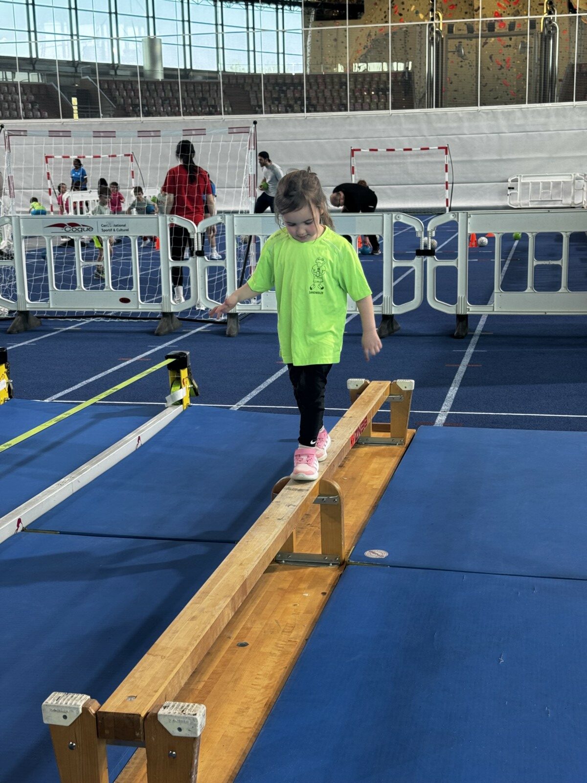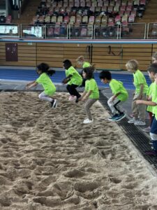 D’Kanner konnten un engem Beweegungsparcours deelhuelen, wou si um Trampolin sprangen, balancéieren, rutschen a klotere konnten. Dobäi haten si d’Méiglechkeet, selwer Erfarungen ze sammelen an hir motoresch Fäegkeeten ze entdecken an auszebauen. Och Weitsprange war Deel vun den Aktivitéiten a gouf vun de Kanner mat vill Freed ausprobéiert. Zousätzlech goufen et verschidden Atelieren. Zum Beispill konnten d’Kanner un engem Danz mat faarwege Dicher deelhuelen oder bei Wuerfspiller matmaachen. Ausserdeem gouf et och e Sprangschlass, wou d’Kanner sech fräi beweege konnten an dobäi vill Freed un der Bewegung haten.