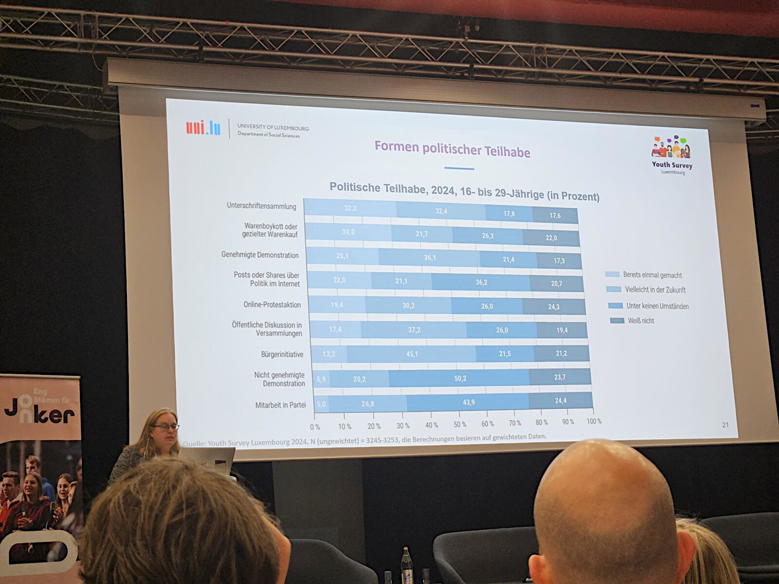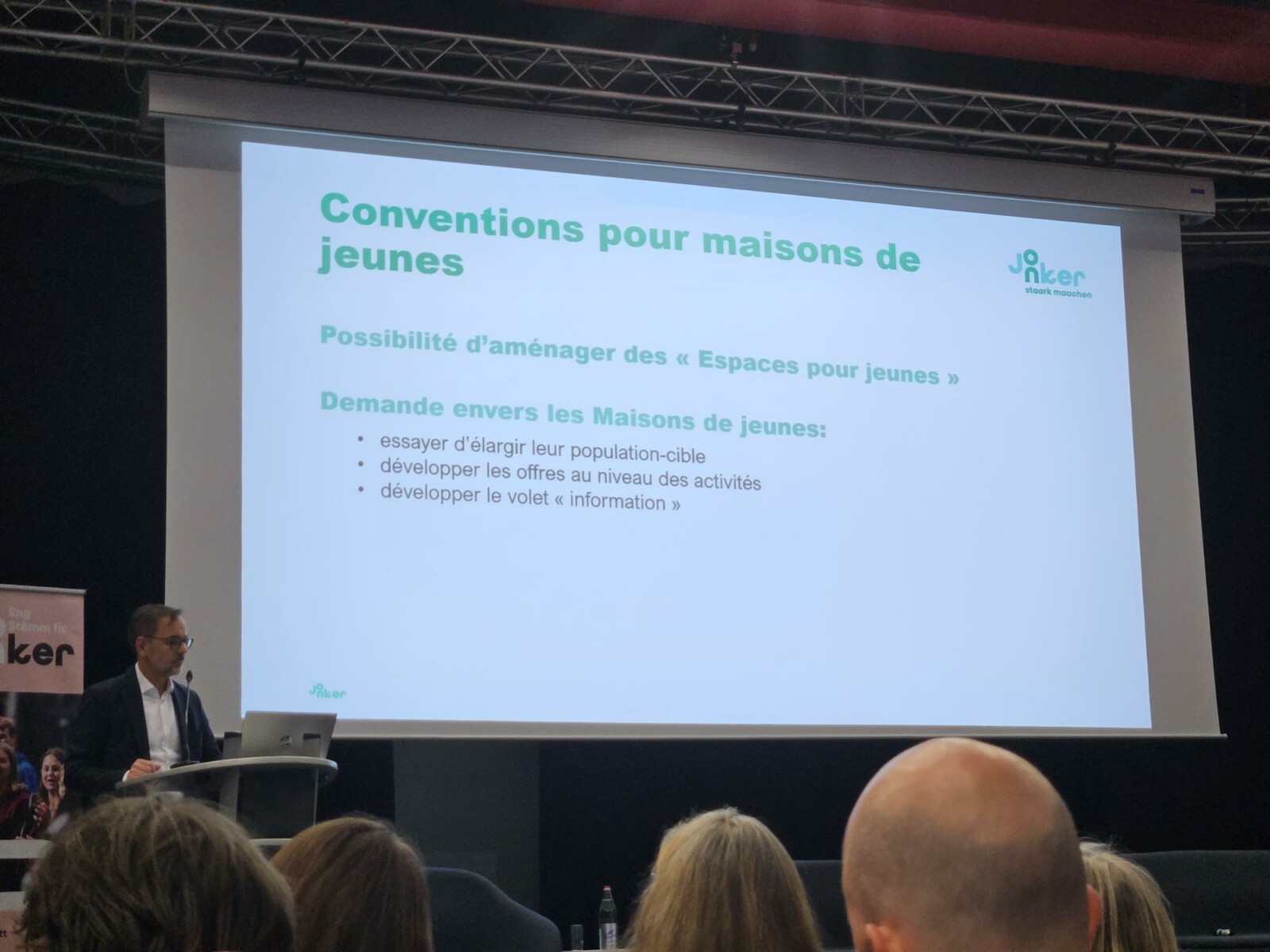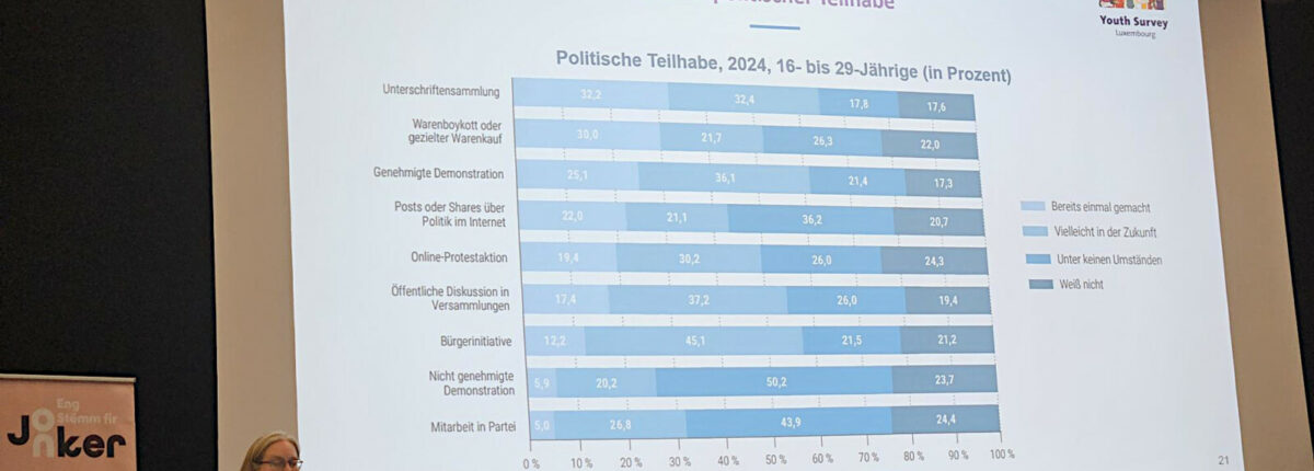 Ainsi, le SNJ a expliqué le nouveau mode de financement des infrastructures des maisons des jeunes et des conventions qui règlent leur fonctionnement. L’Université du Luxembourg a présenté des points phares de sa récente étude sur la jeunesse. Deux points nous y ont interpellés : les jeunes réclament plus de participation réelle à la société et, en même temps, l’intérêt pour la politique est en diminution.