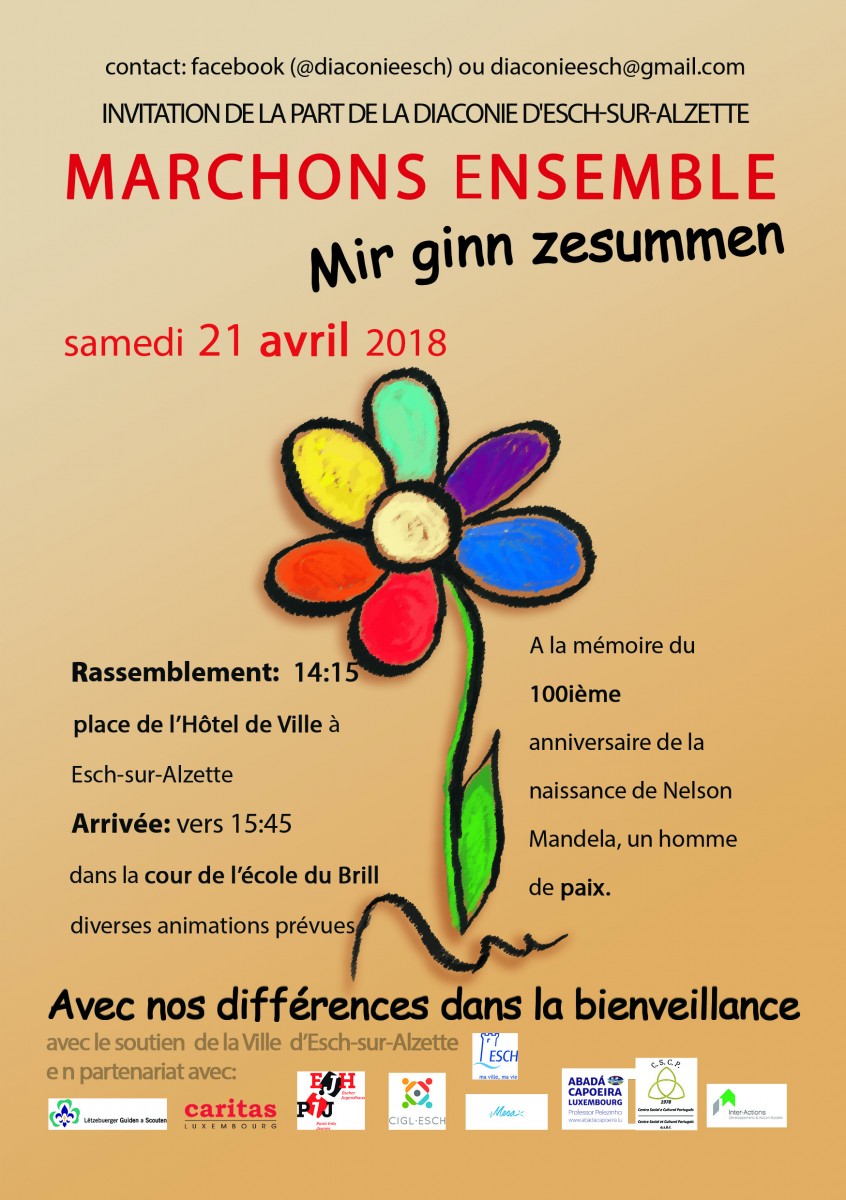 Organisation et Partenaires : Diaconie d’Esch-sur-Alzette, Caritas asbl (Foyer pour Réfugiés Grand Rue), Inter-Actions asbl (Ensemble Al Esch-Brill-Grenz), Lëtzebuerger Guiden a Scouten, PIJ Esch, Transition Minett Mesa, Escher Jugendhaus, KUFA, CIGL Esch, Centre Social et Culturel Portugais asbl, Service de l’Égalité des Chances de la Ville d’Esch/Alzette