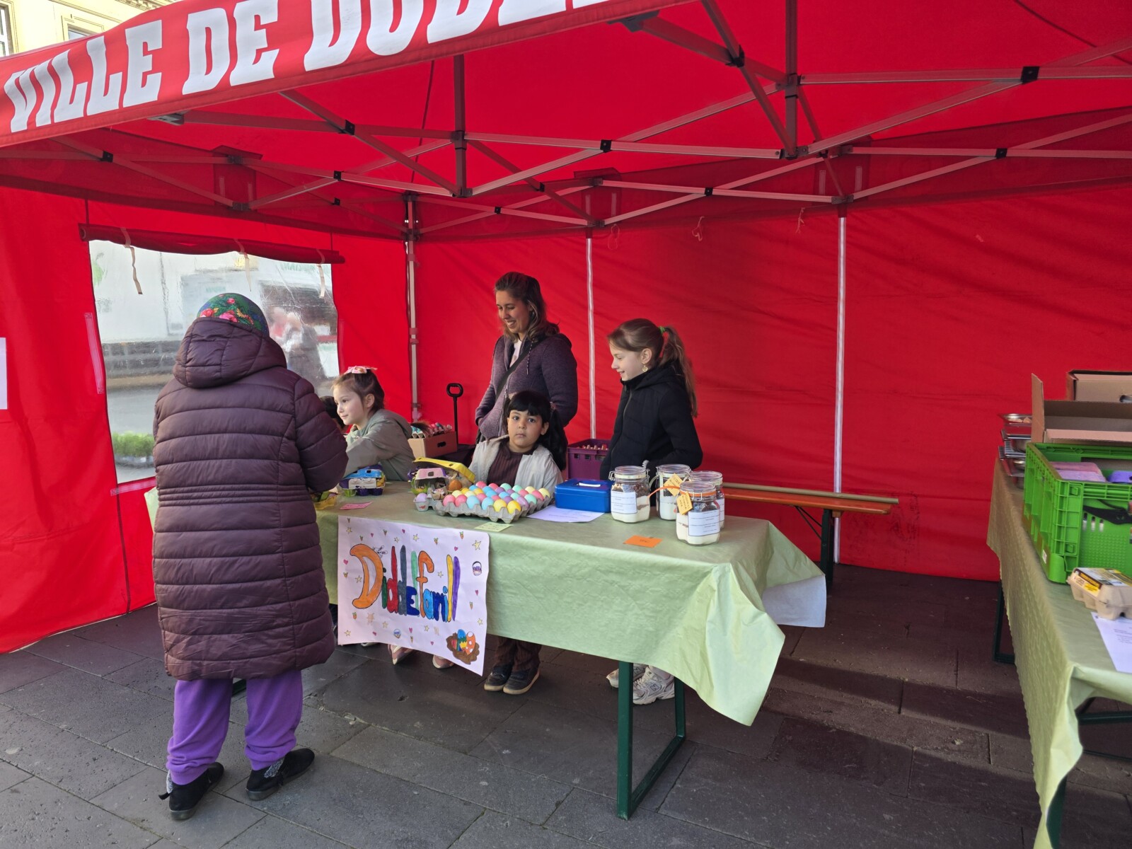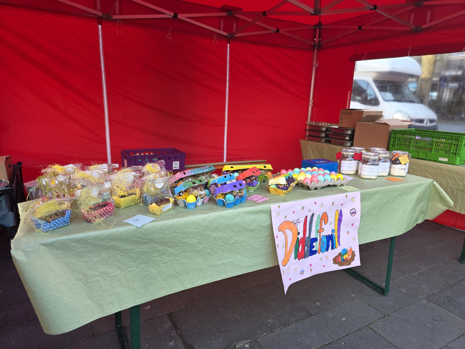 Durant les vacances de pâques le Foyer Diddelfamill a participé au marché hebdomadaire de Dudelange. À cette occasion, nous avons tenu un petit stand où étaient proposés des pâtisseries et œufs de pâques préparées par les enfants avec l’aide précieuse de notre équipe de cuisine.
