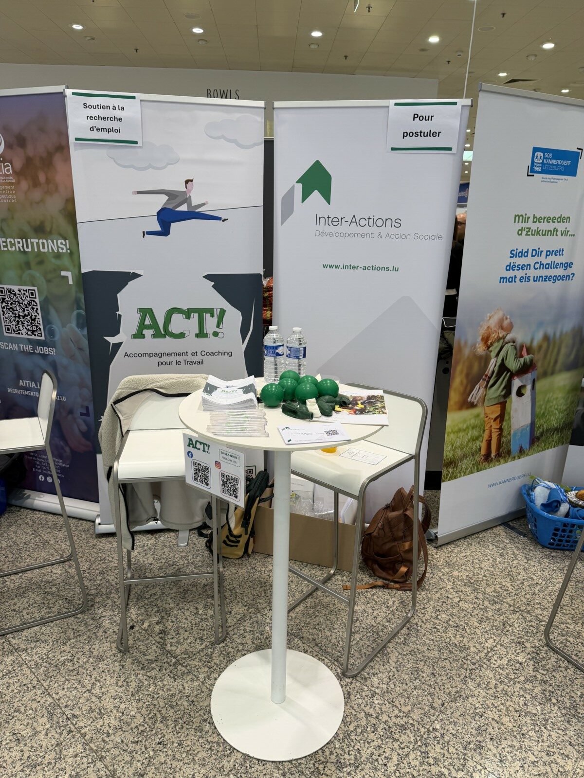 Présents sur le stand d’Inter-Actions asbl, notre service des Ressources Humaines ainsi que notre service de réinsertion socio-professionnelle ACT! ont accueilli de nombreux visiteurs tout au long de la journée. Ce fut l’occasion de présenter nos métiers, nos valeurs et les différentes possibilités d’accompagnement et d’évolution au sein de notre organisation. Cette journée a été marquée par des discussions constructives, un réel intérêt pour nos activités et de belles perspectives de collaboration.