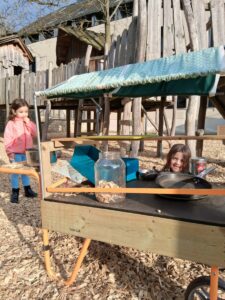 Nous avons installé notre cuisine mobile dans la cour, sur le paillage. Avec des poêles et différents ustensiles de la cuisine, les enfants ont cuisiné, « préparé » des plats et laissé libre cours à leur créativité.🍕