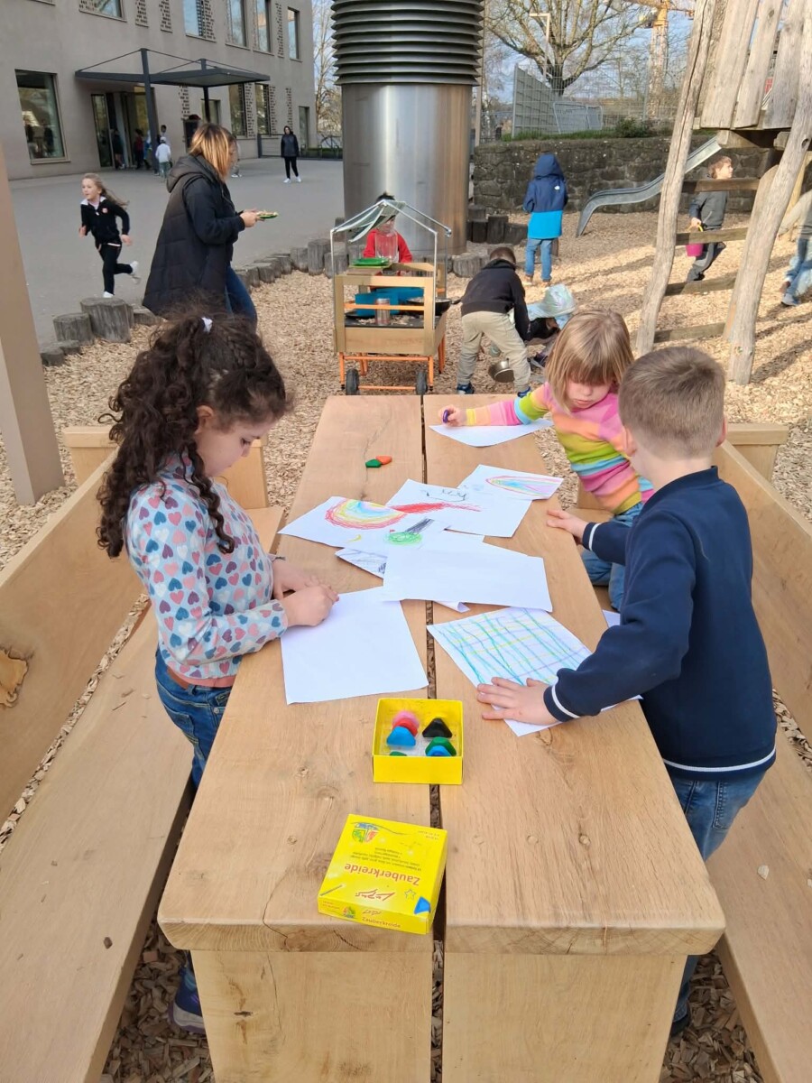 Sur un banc dans la cour, des feuilles et du matériel de dessin étaient à disposition. Certains enfants s’y sont installés pour dessiner et partager un moment calme ensemble.🖍️🖍️🖍️